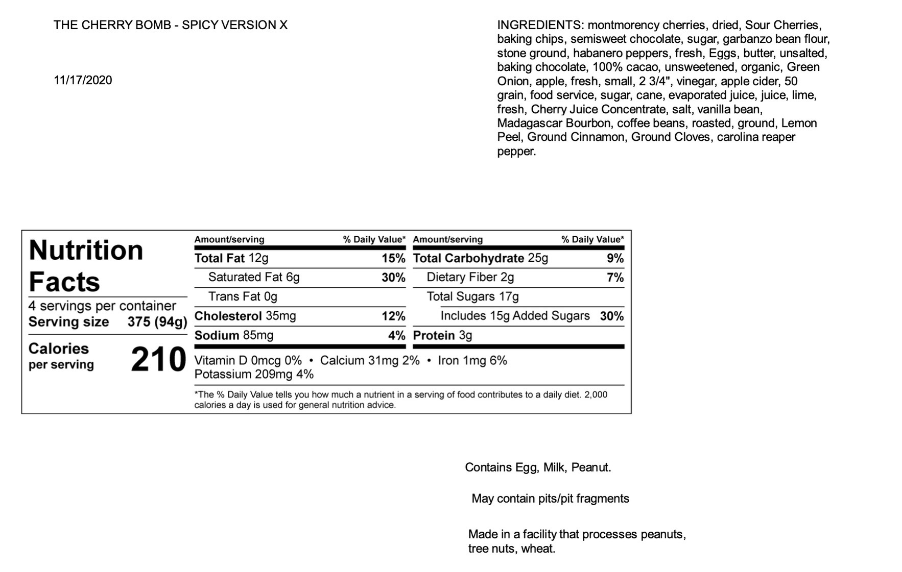 The Cherry Bomb - Chocolate Cherry Fudge Brownie - Old Agness Store is proud to announce their collaboration with The Karma Sauce Company, one of the best Sauce Makers in the USA with this Fabulous Brownie! The Cherry Bomb Brownie, weighing in at over 1/2 pound, is chock full of Whole Montmorency Dried Cherries direct from Shoreline Farms of Michigan, Semi-Sweet Chocolate Chips from Guittard Chocolatier, All Natural and Gluten Free Ingredients and…wait for it… a full bottle of Karma Sauce Cherry Bomb Sauce per pan!