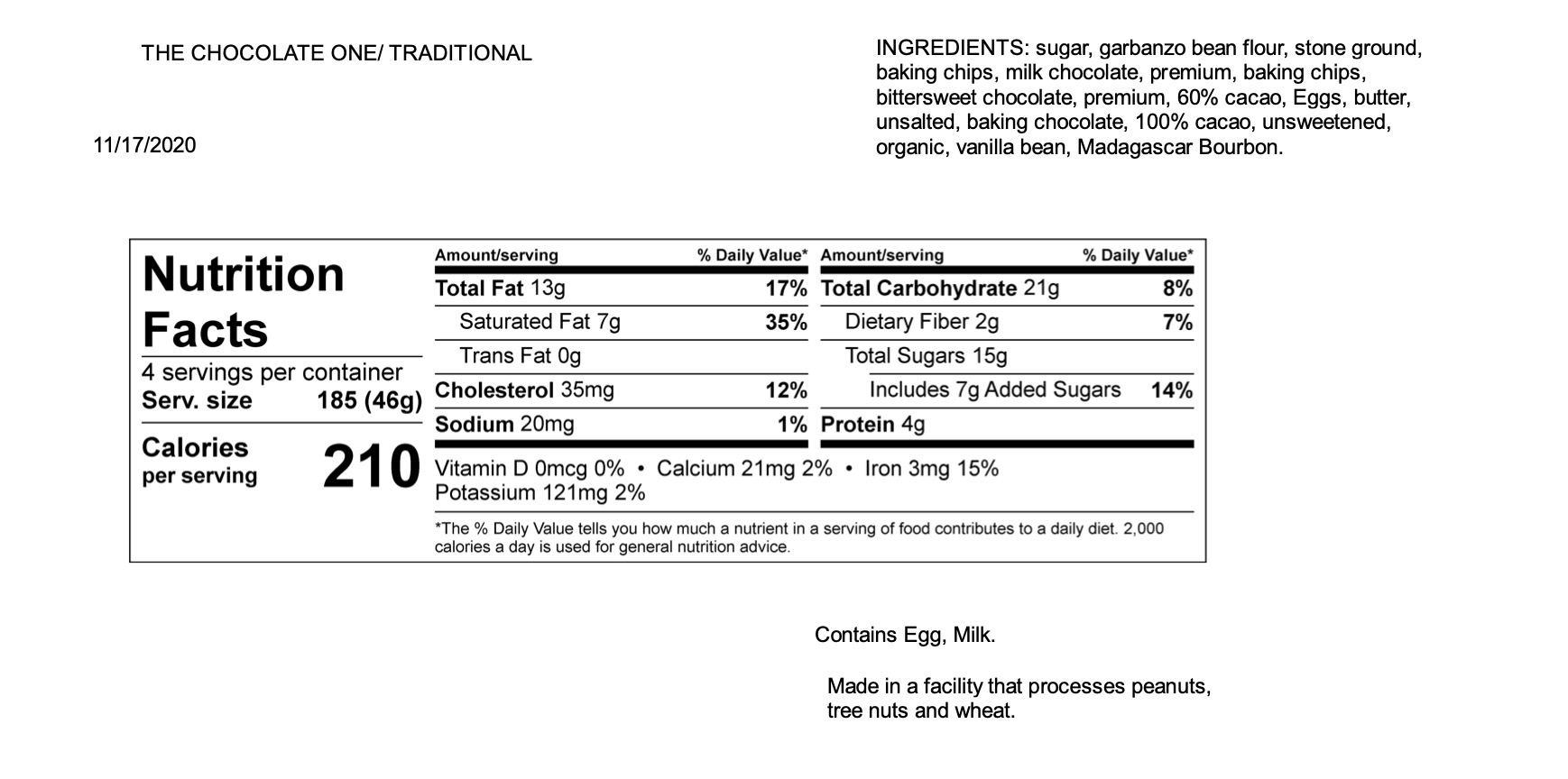 Eggs, Butter Sugar, Garbanzo Bean Flour, Unsweetened Chocolate, Dark Chocolate, Milk Chocolate, Vanilla.
