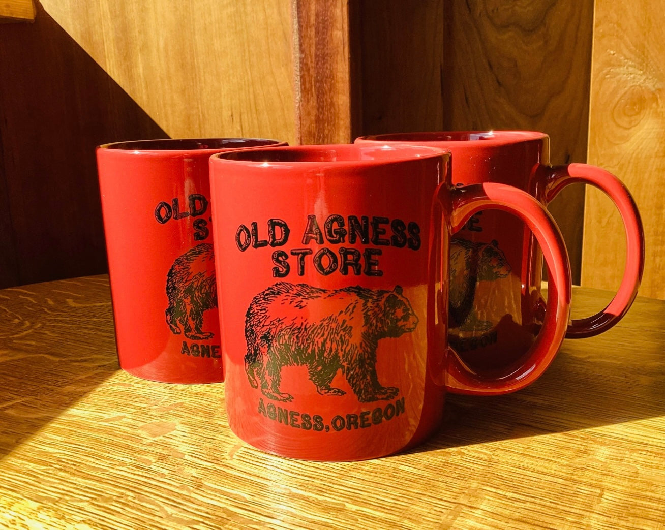 Stamped with the words “Old Agness Store, Agness, Oregon” and featuring our iconic bear logo, the Old Agness Store®️ Mugs are perfect for tea or coffee, and makes a wonderful gift.