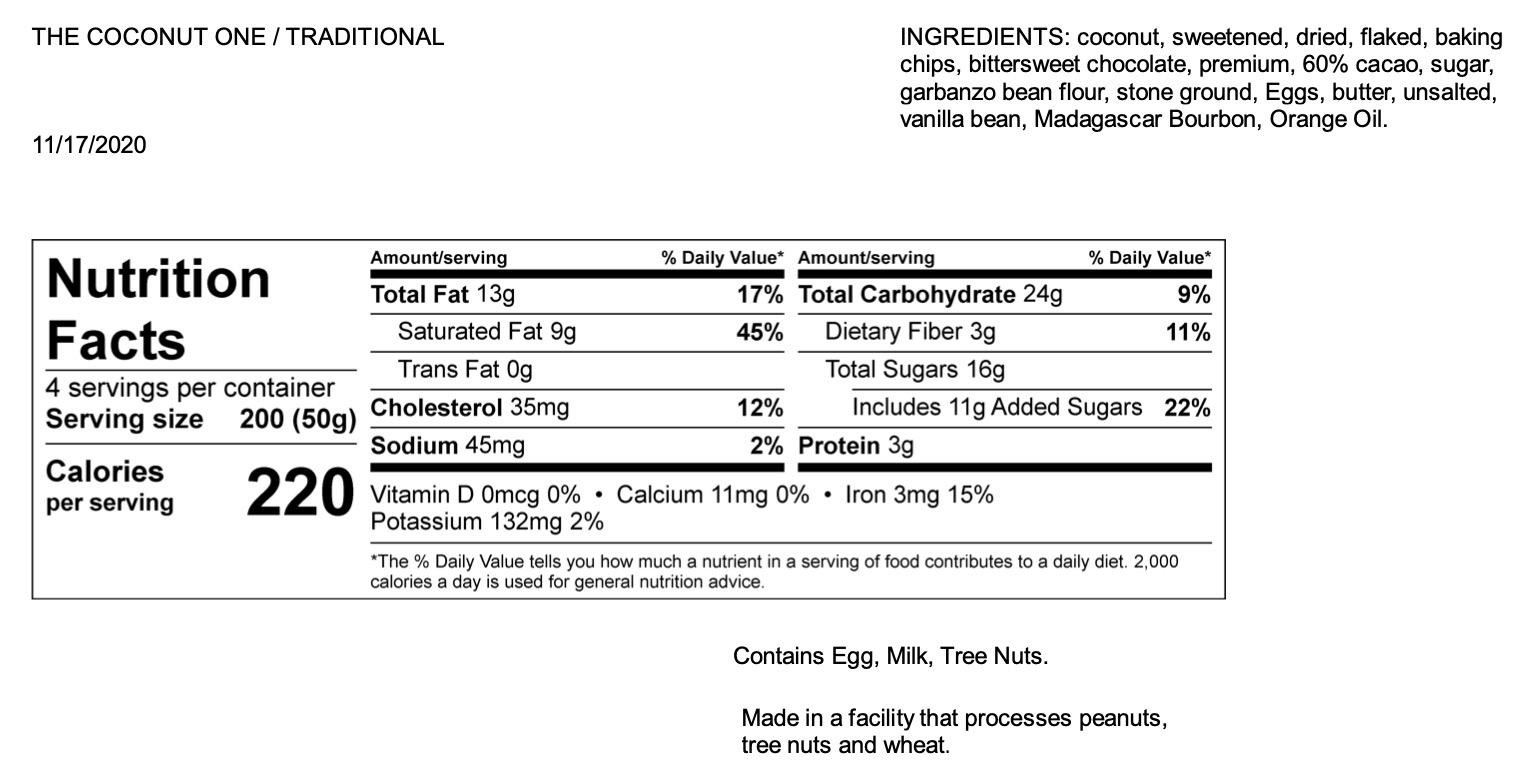 Eggs, Butter Sugar, Sweetened Coconut, Dark Chocolate, Garbanzo Bean Flour, Vanilla, Orange.