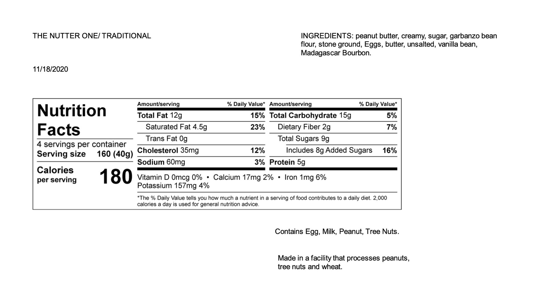 Eggs, Butter Sugar, Peanut Butter, Garbanzo Bean Flour, Reaper Pepper ( For the exception of the Traditional ) Vanilla.