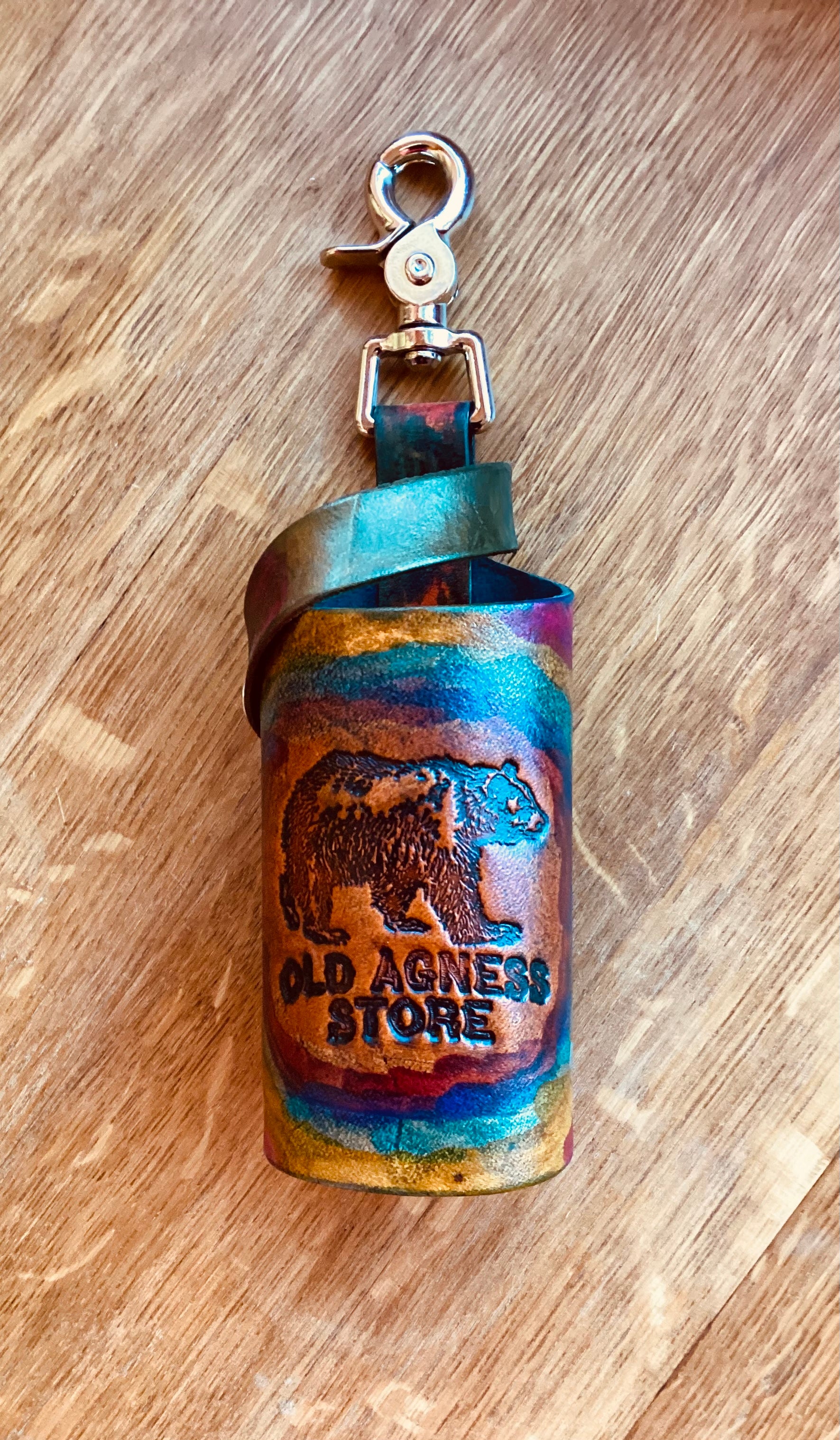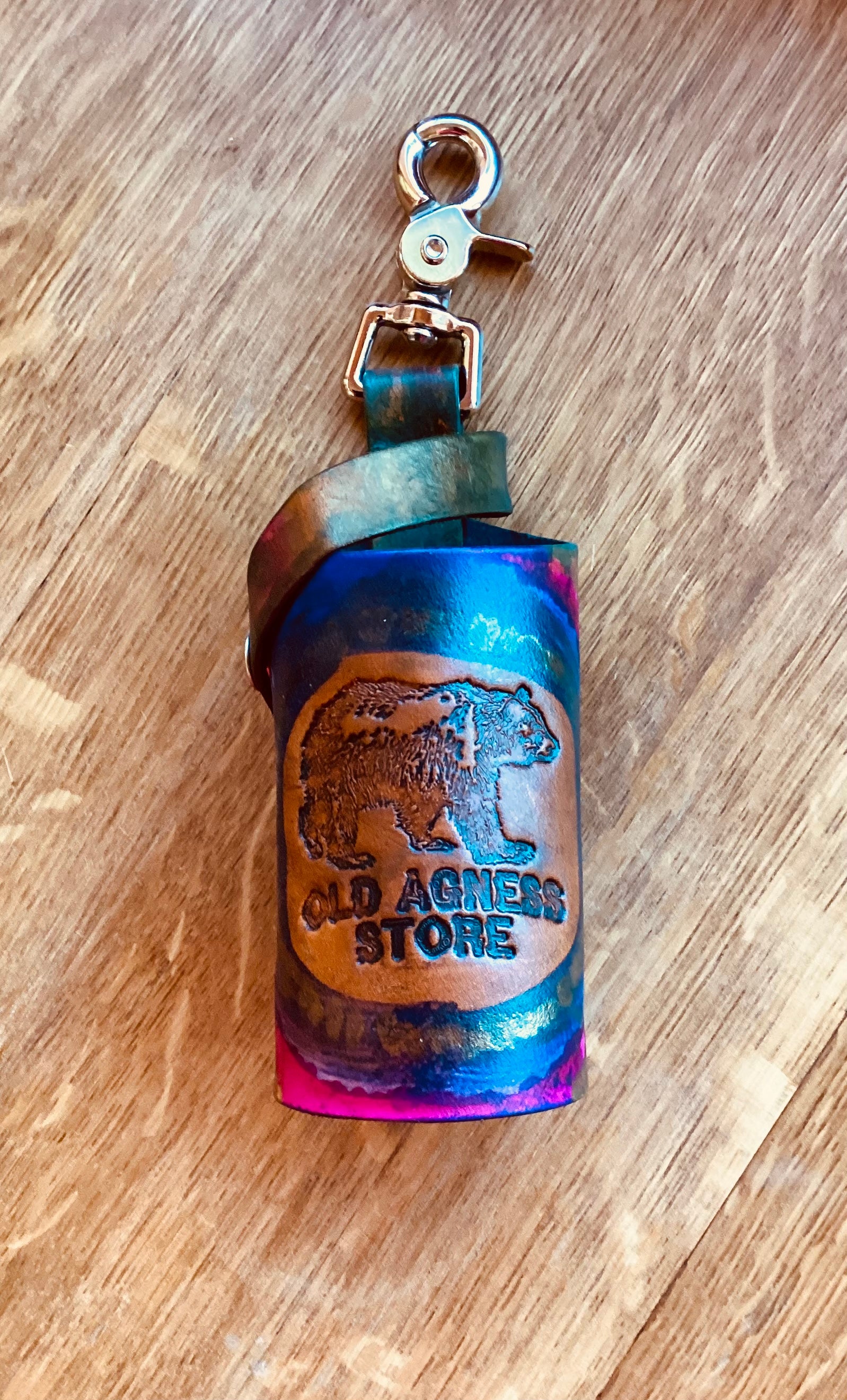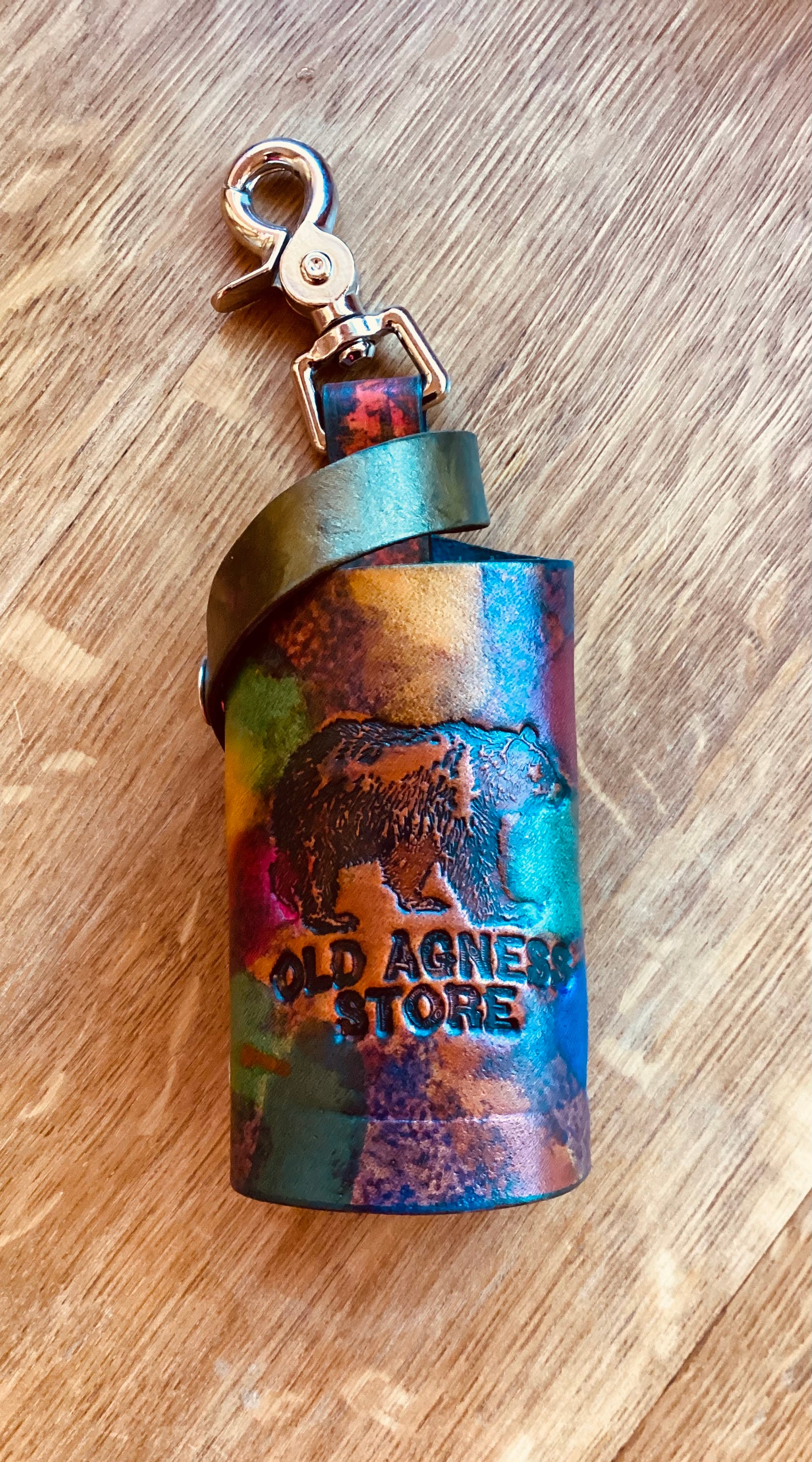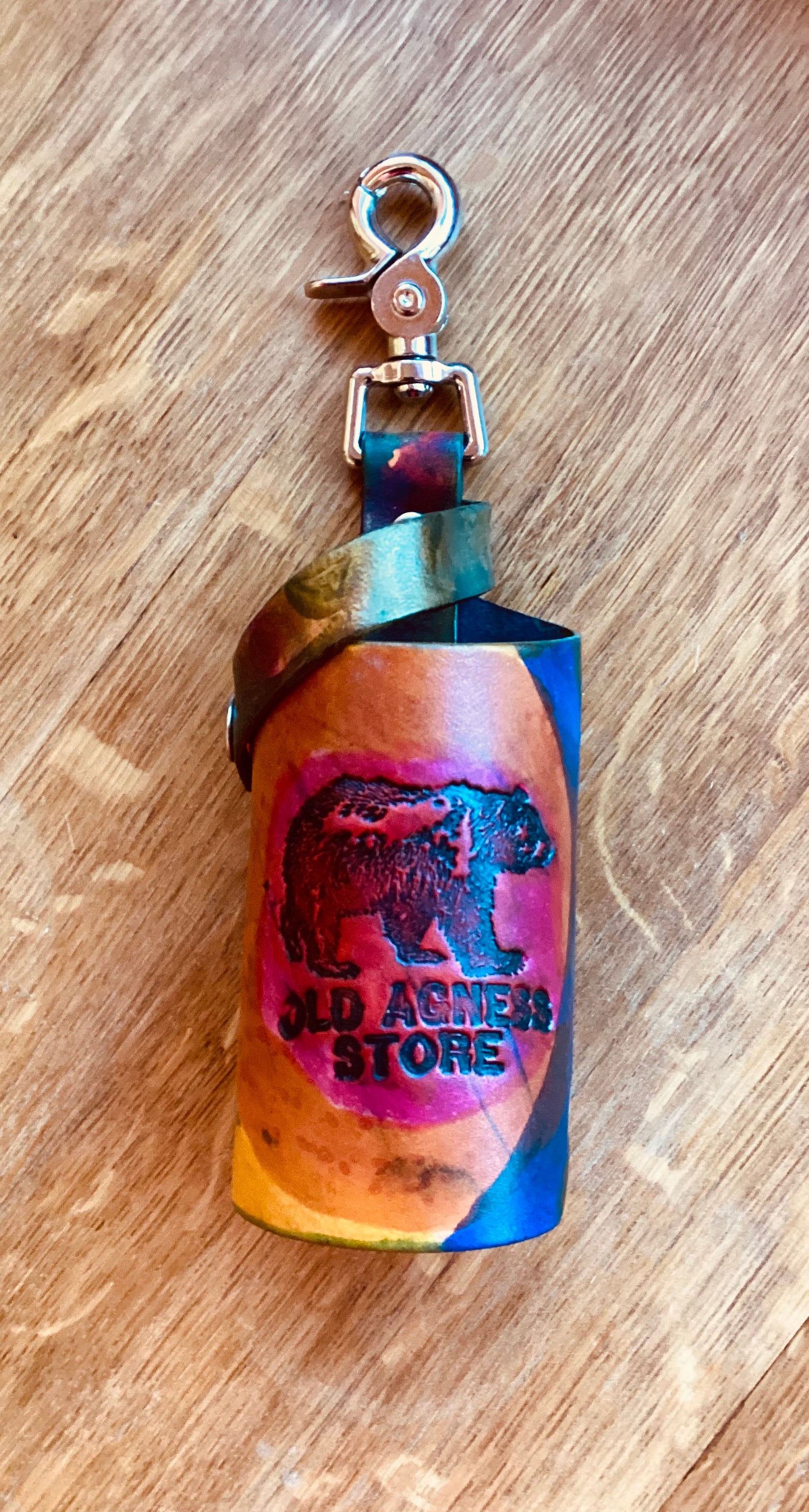 Our Holsters are hand crafted from New Leather, are embossed with the Old Agness Store Logo and are available in three selection: Red, Tan or the new kid on the block…TIE DYED!