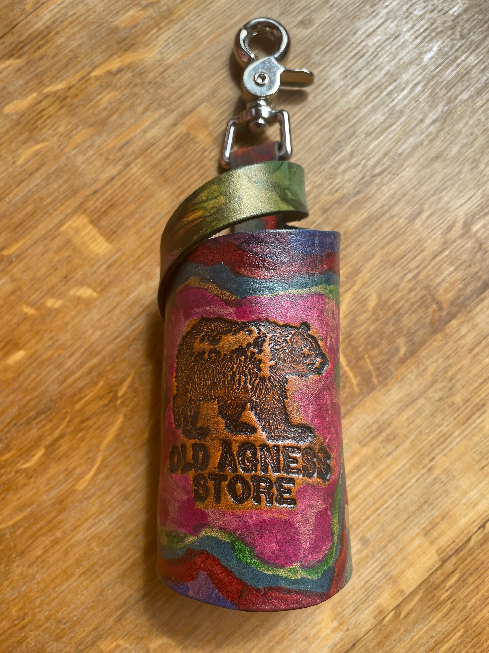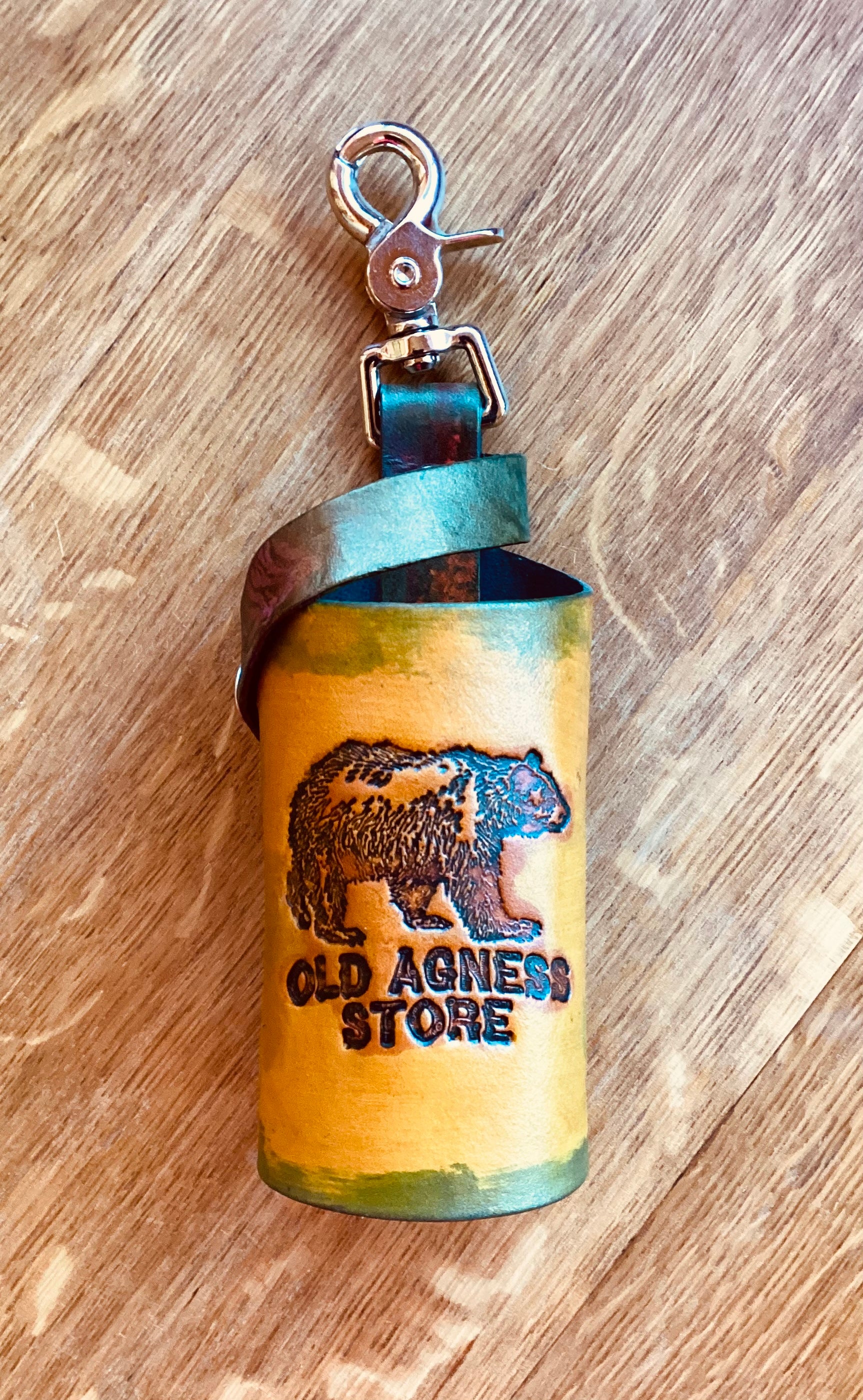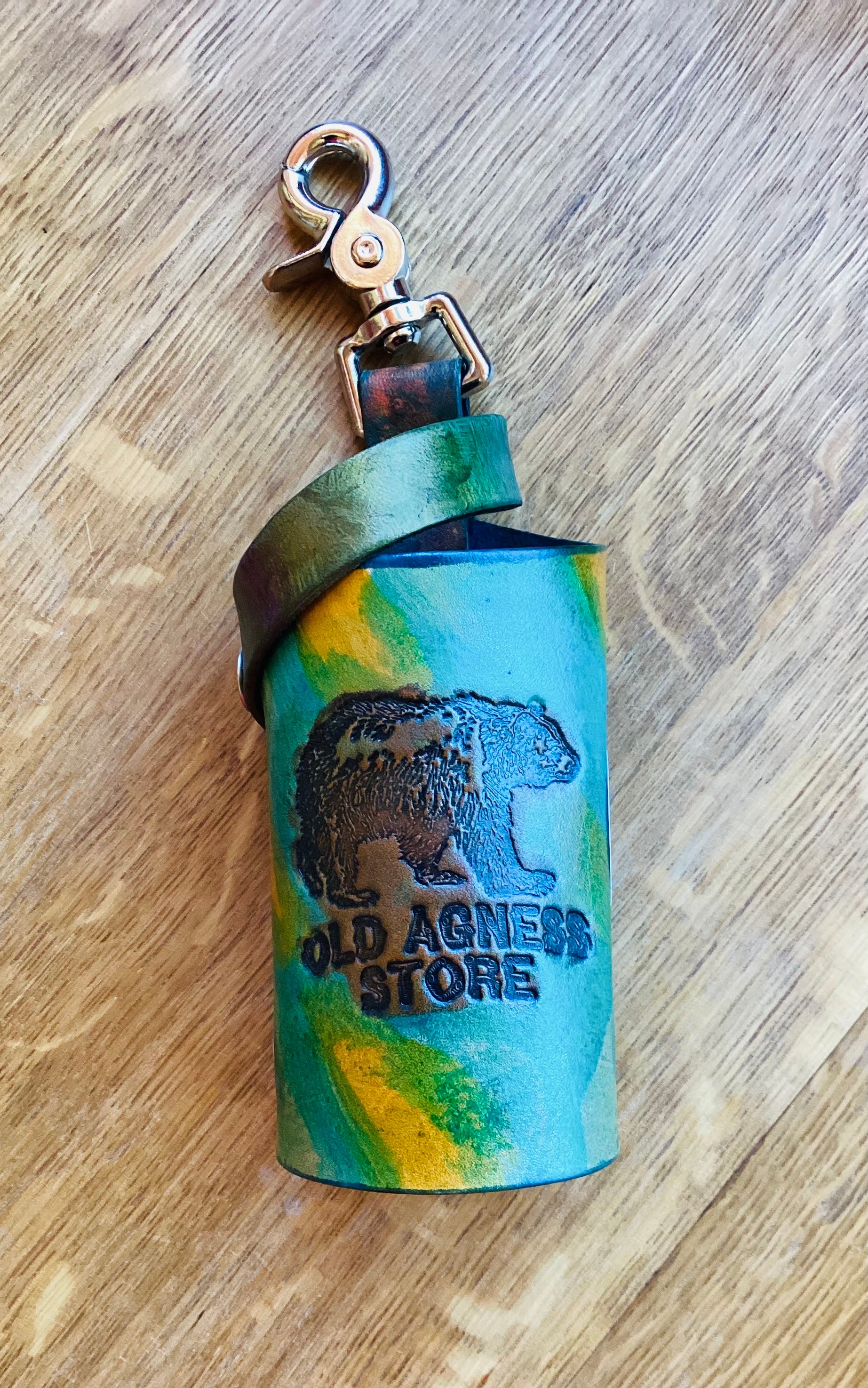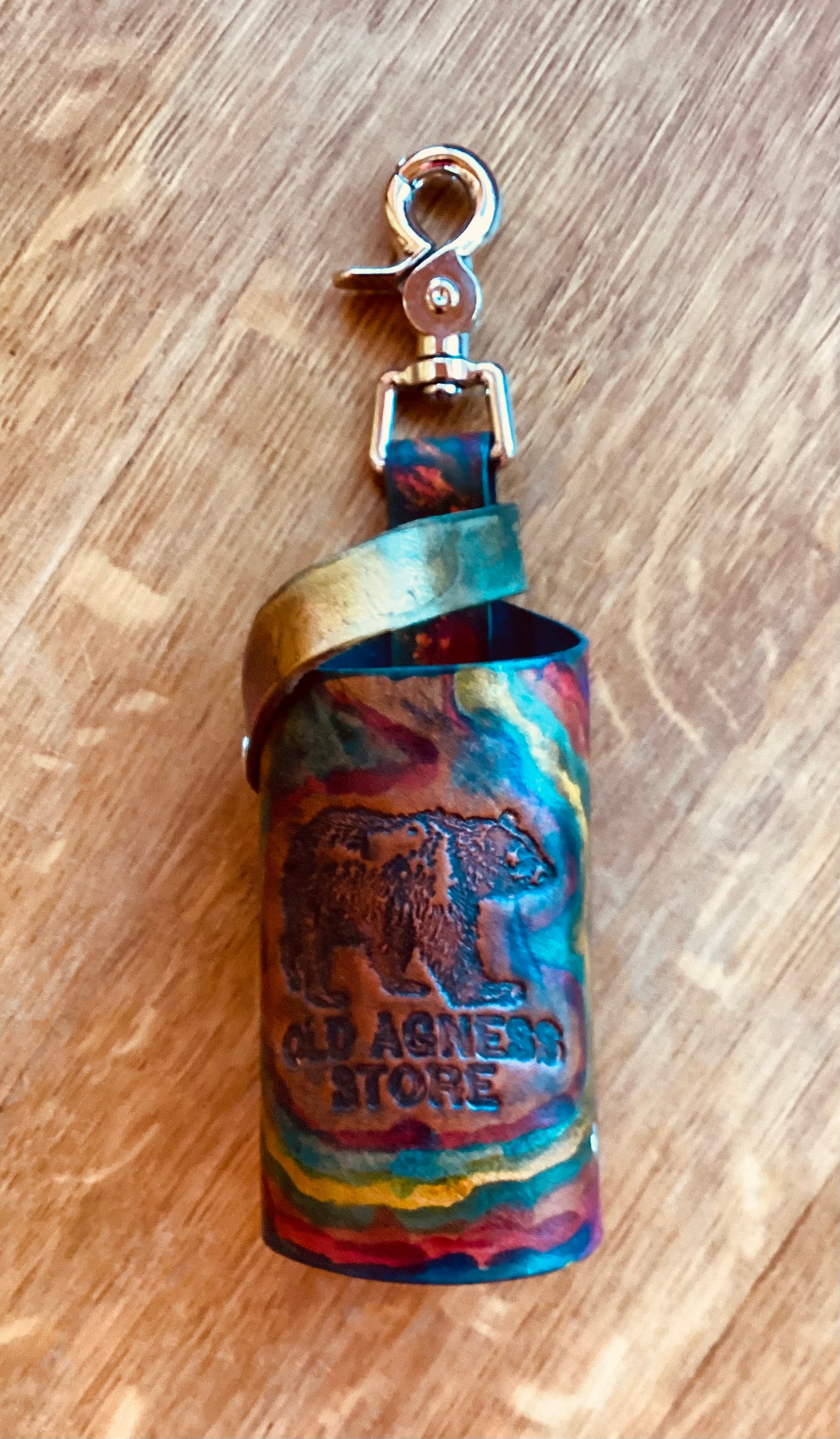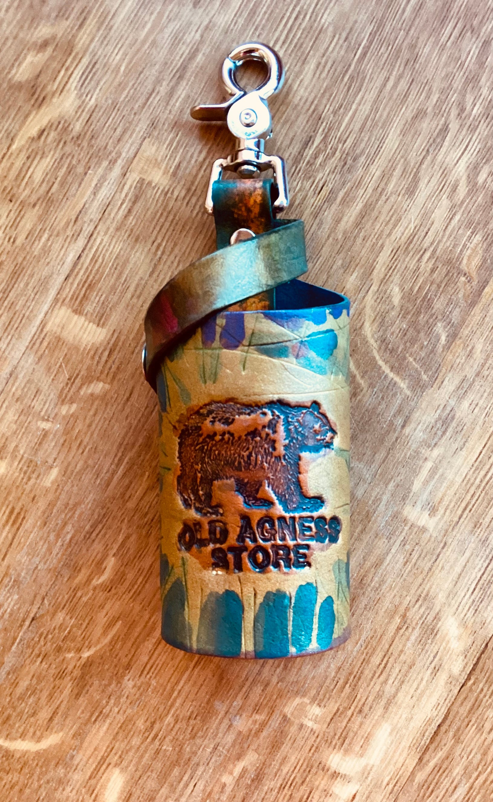 Our Holsters are hand crafted from New Leather, are embossed with the Old Agness Store Logo and are available in three selection: Red, Tan or the new kid on the block…TIE DYED!